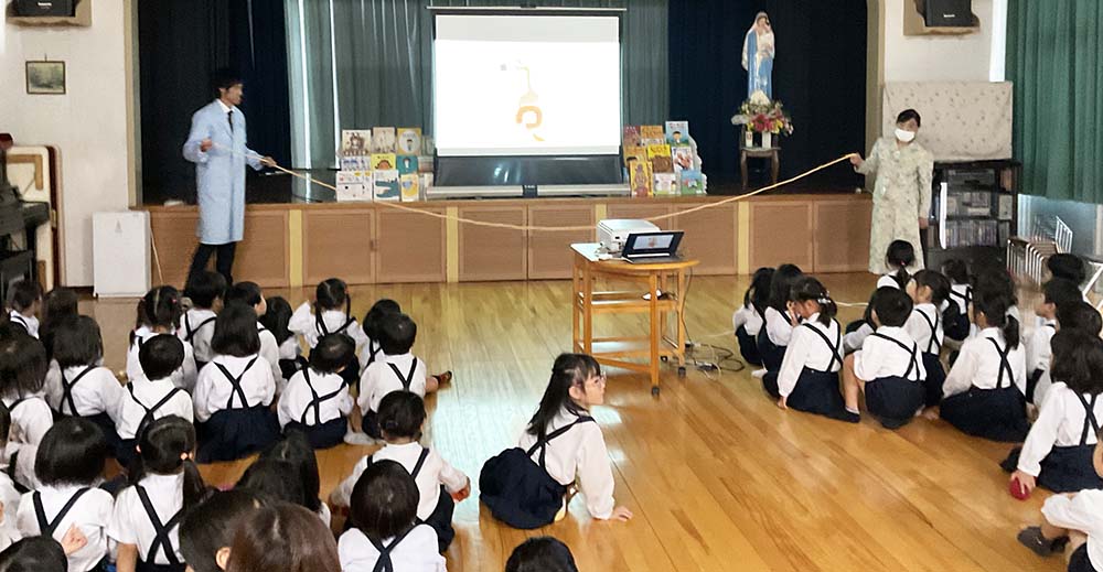 子どもたちが日頃から親しんでいる“紙芝居”を使って、「元気なうんちの見分け方」や「良いうんちのつくりかた」から「うんちは何でできているのか」などを伝えていきます。